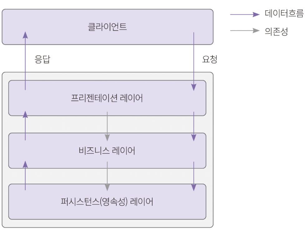 - 프레젠테이션, 비즈니스로직, 데이터 저장 계층 수행