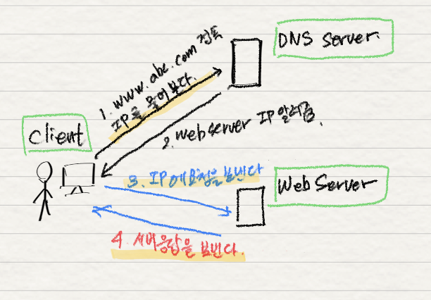 ✅ 클라이언트가 DNS 서버로 ip를 물어보고 DNS서버 가 알려준 IP로 요청을 보내면 웹서버가 응답을 보낸다.