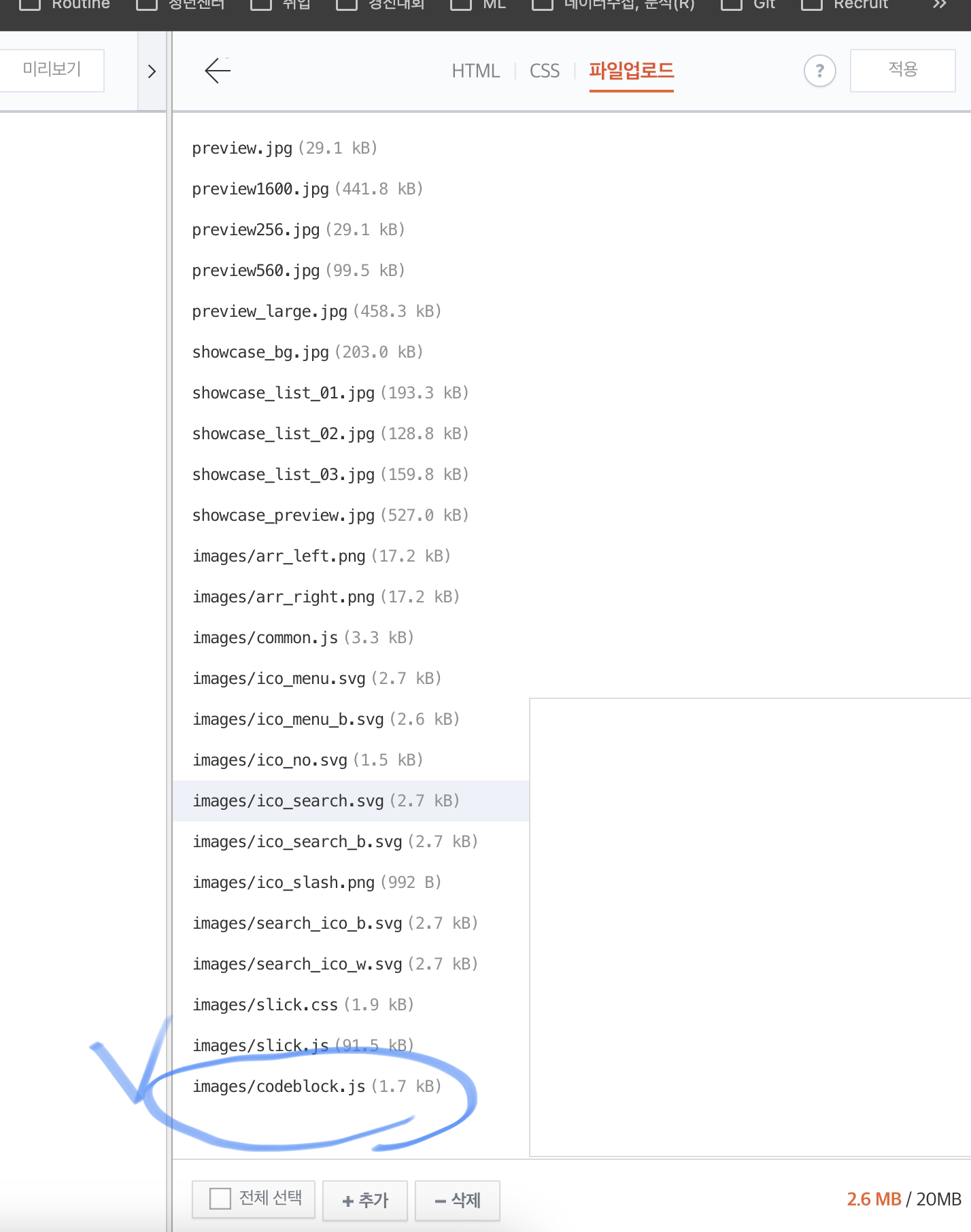 티스토리 html 편집 -> 파일 업로드 탭을 클릭 -> 추가 버튼 클릭 -> js 파일 선택 -> 적용