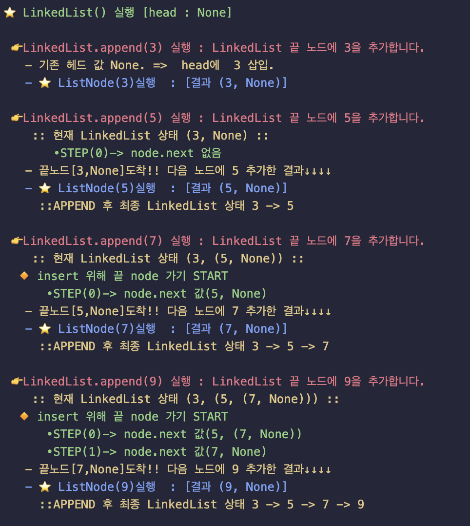 F.r(f"\n 👉LinkedList.append({val}) 실행 : LinkedList 끝 노드에 {val}을 추가합니다.")