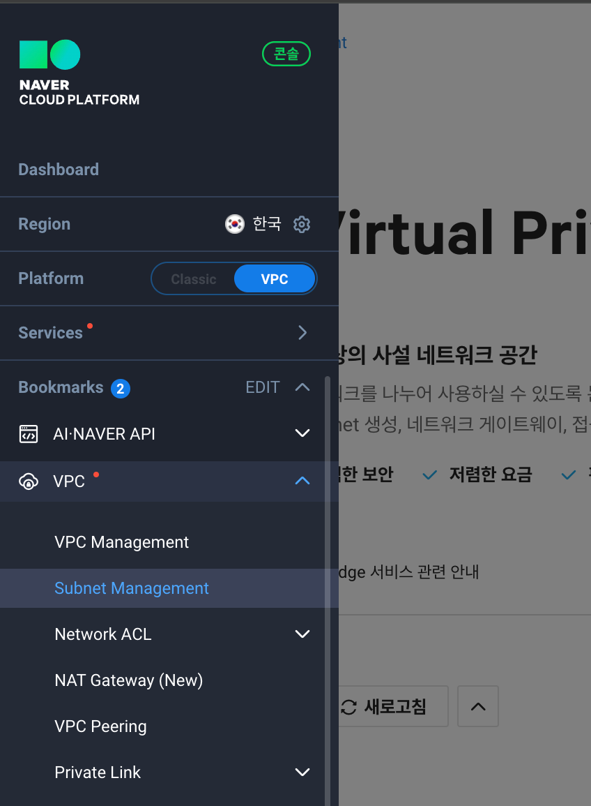 - 콘솔 클릭 -> 좌 사이드바 에서 VPC(virtual private cloud) 인지 확인 -> service -> vpc 클릭