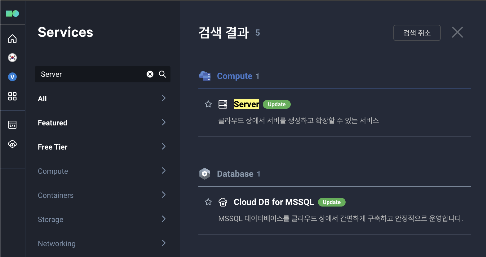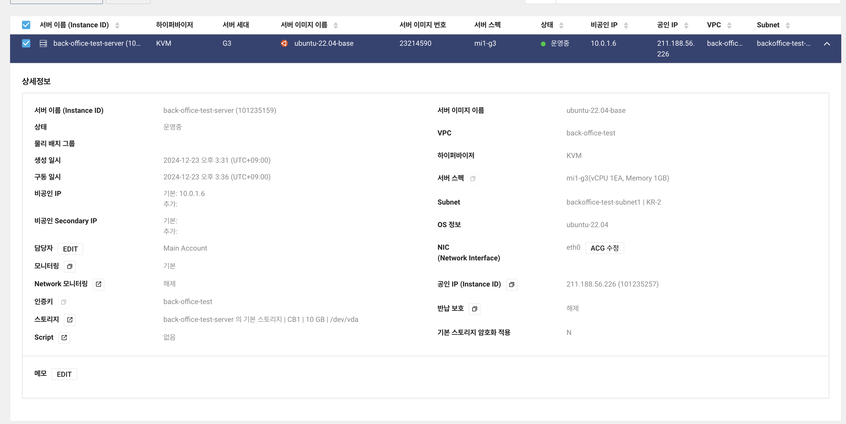 보유 ACG (Access control group: 방화벽 구축 없이 서버 크룹에 대한 접근제어 관리 상품) 선택 - server 생성 버튼 클릭 -> 수분 수십분 소요