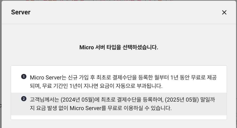 : 신규강비후 최초 결제 등록 한 월 부터 1년동안 무료 제공, 무료기간 지난후 요금 자동 부과 2025.5 월말 까ㅣ 죵금 발생 없음. - micro, mi1-g3(vCPU 1EA, memory 1GB ) 체크