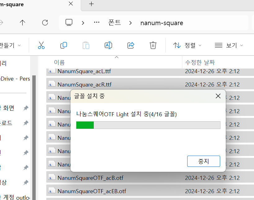 폰트 이름으로 검색한뒤에 다운로드 > 모든 파일 선택 > 오른쪽 클릭 >설치