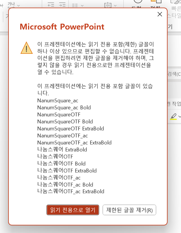 [PPT] 읽기 전용으로 열기 제한된 글꼴 제거
