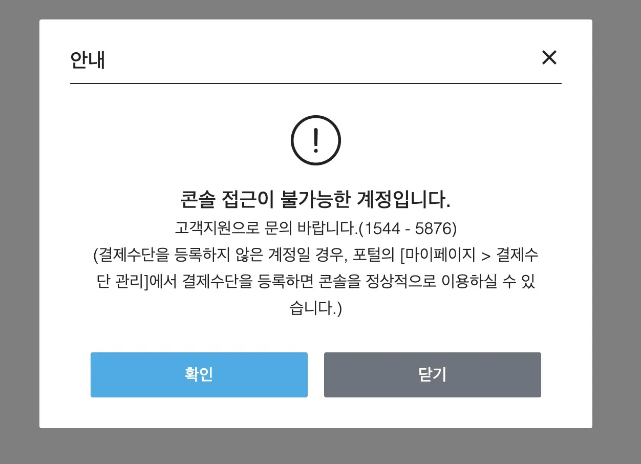 콘솔을 들어가려했지만 미납 상태여서 결제 수단을 변경하라고 먼저 한다.