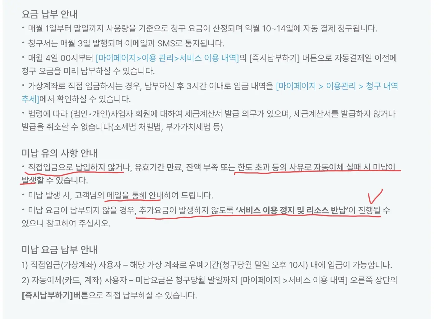 미납 발생시 메일을 통해 안내 가 된다고 한다.