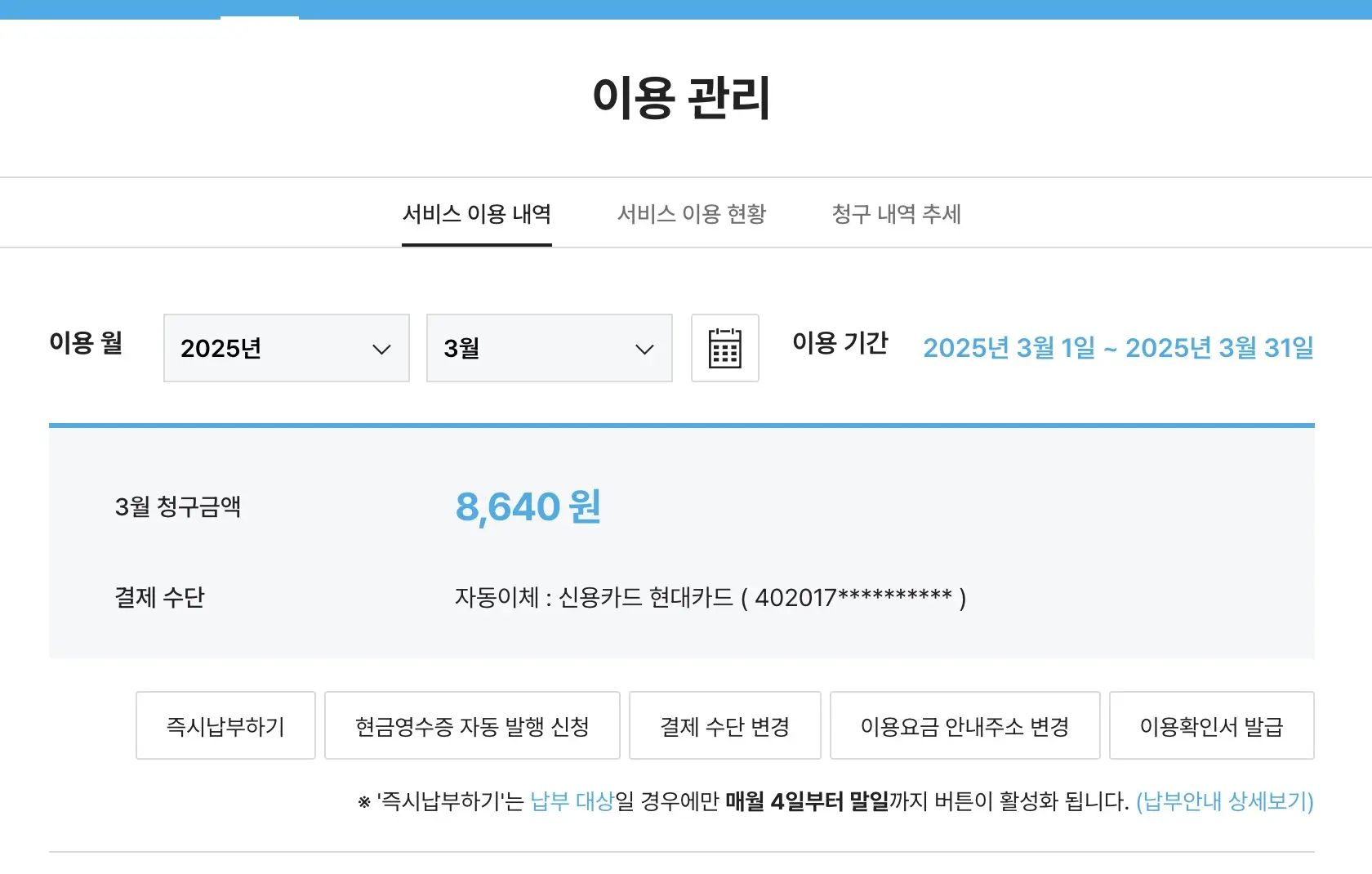 결제 수단을 변경하고 기다리면 미납요금이 한꺼번에 나간다고 한다.