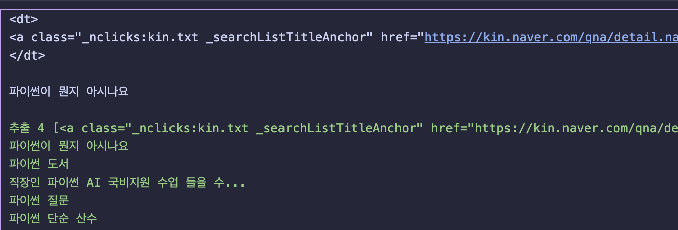- naver 지식인 검색 '파이썬'-> fn + f12(inspect mode) -> 특정 링크를 클릭해서 html 을 선택-> copy selector-> css