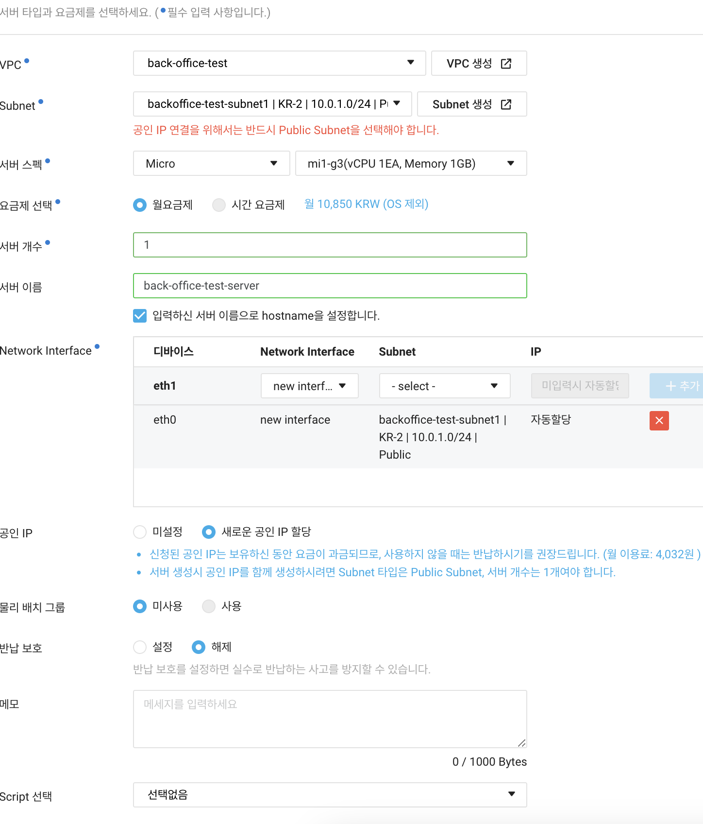 : 신규강비후 최초 결제 등록 한 월 부터 1년동안 무료 제공, 무료기간 지난후 요금 자동 부과 2025.5 월말 까ㅣ 죵금 발생 없음. - micro, mi1-g3(vCPU 1EA, memory 1GB ) 체크