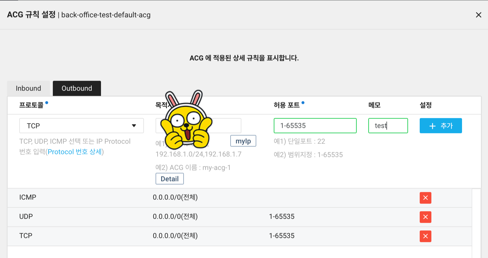 - 사이드바에서 Server->ACG-> ACG 설정 클릭 -> 아웃바운드 0000 삭제, myip 추가