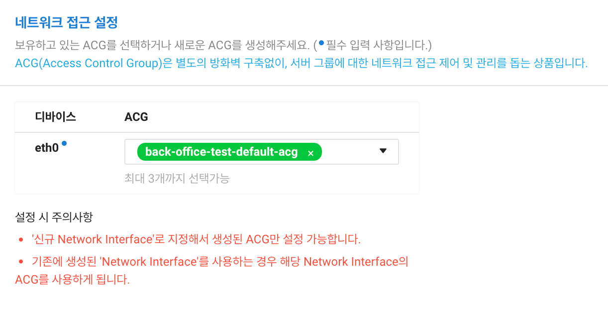 보유 ACG (Access control group: 방화벽 구축 없이 서버 크룹에 대한 접근제어 관리 상품) 선택 - server 생성 버튼 클릭 -> 수분 수십분 소요