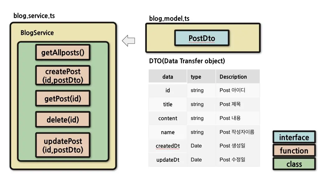 - 클래스의 생성자에 매개변수로 설정된 타입이 프로바이더로 설정된 타입중 하나라면 , NestJS 에서 자동으로 필요한 객체를 주입해줌. BlogRepository는 인터페이스이므로 클래스를 생성 할수 없음. 따라서 의존성을 주입할수 없음. 의존성을 주입할때는 실제로 사용할 클래스를 타입으로 주면 됨
