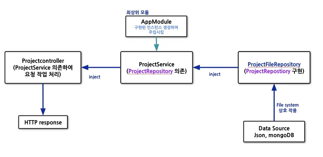 순서 : 리포지터리,서비스 데코레이션 추가 > 컨트롤러와 서비스의 의존성선언 > AppModule의 @Module 데코레이터에 프로바이더 설정 추가