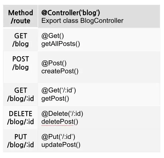 | 라우터 | 직접 라우터 함수 추가 ,미들웨어 | @Controller() 데코 사용 |