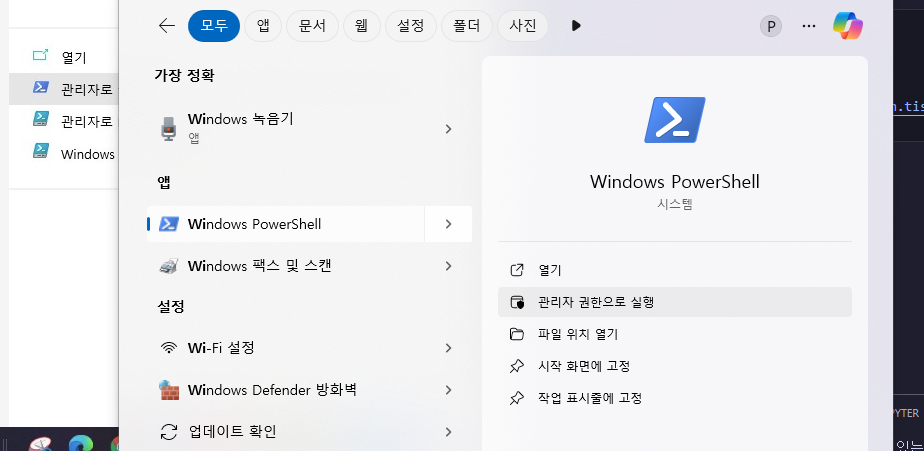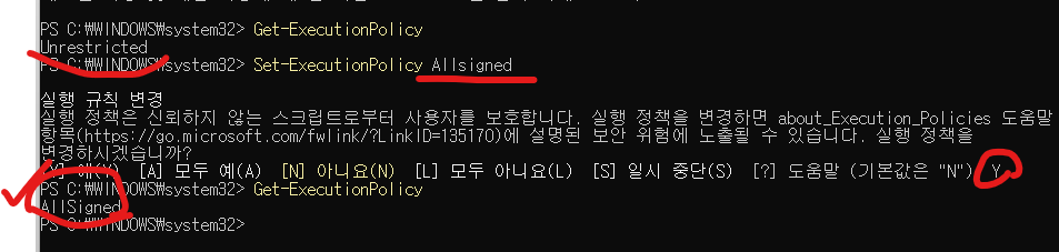2) Get-ExecutionPolicy 를 통해 제한 설정 정보를 확인한다. Unrestricted 가 뜨면 좋은것 restrict 가뜨면 Set-ExecutionPolicy AllSigned 명령어를 쳐서 정책을 바꾸어 준다.