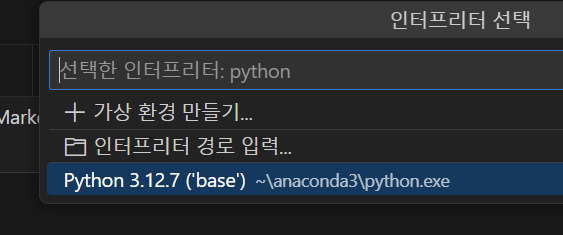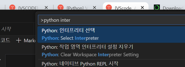 기존에 켜져있던 terminal을 우상단 휴지통 모양의 아이콘을 눌러 삭제한 후, Ctrl + Shift + P 를 누르고 "Python: Select Interpreter"을 입력하여 실행