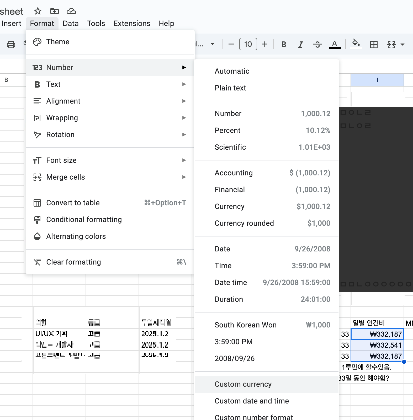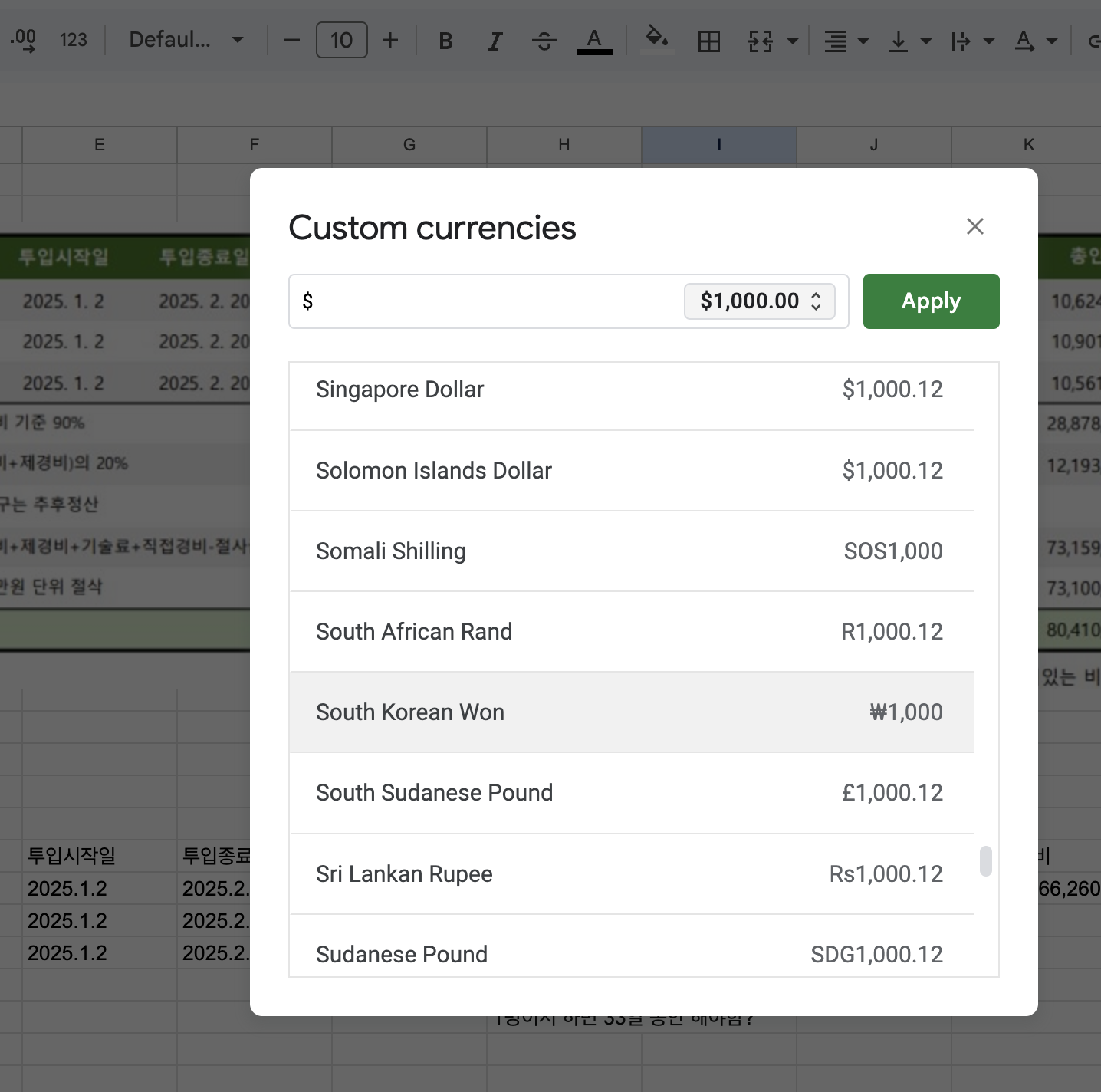 구글 스프레드 시트를 작성 할때 가격 표기 어떻게 할까?