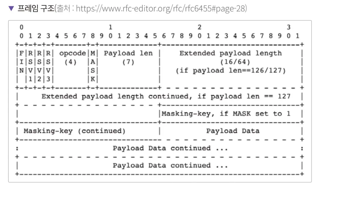 - 헤더에는 FIN, RSV1~3, 오프코드(opcode) , 마스크(MASK) ,payload 길이 , 마스킹 키 가 있음.