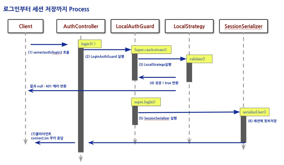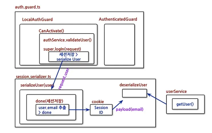 - super.logIn()에서 로그인 처리, 세션저장함. 세션에서 꺼내오는 방법은 session.serializaer.ts 파일에서 작성