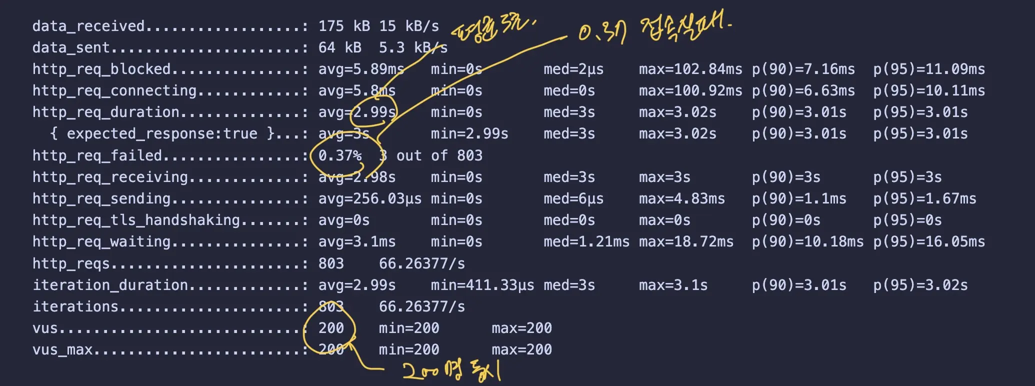 vus( 접속자) 를 200 명으로 늘리면 실패율이 0.37% 가 된다.