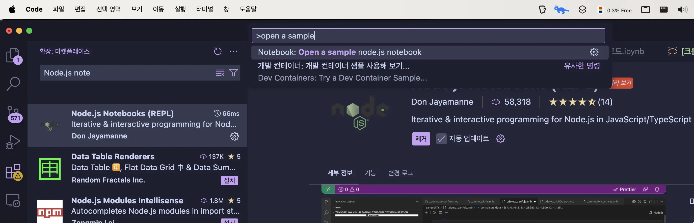 (1) Extension > Node.js note > 설치 > open a sample node.js notebook