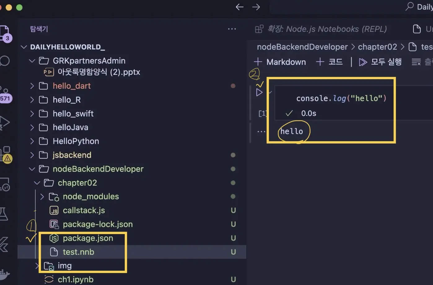 | 💁♂️해결방법💊 | Node.js notebook 이라는 extension 을 설치한다. |
