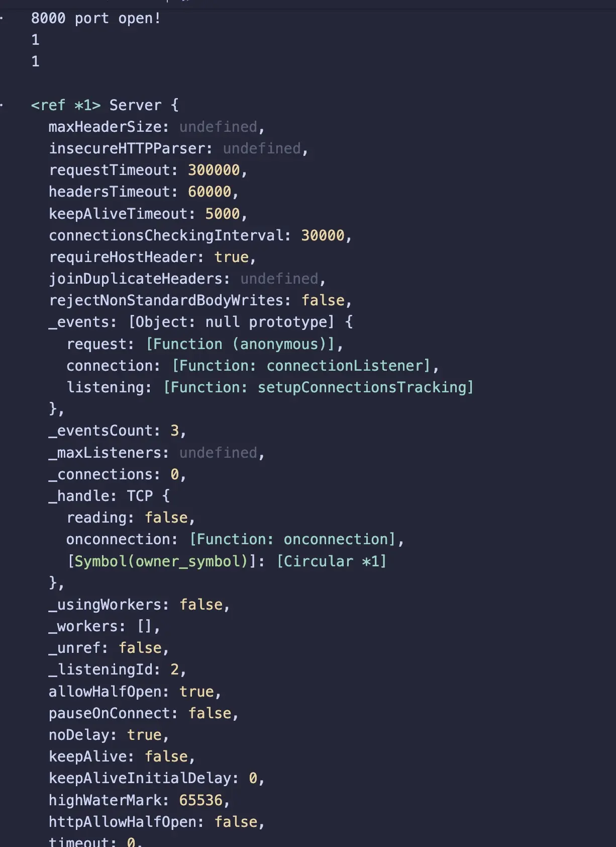 - server.listen(8000, ()=> console.log("Hello Node.js")); :