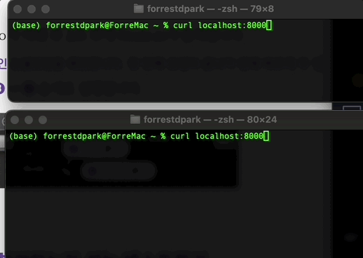 terminal 에 curl 을 두개 띄워서 빠르게 서버접속하여 비동기 처리 확인